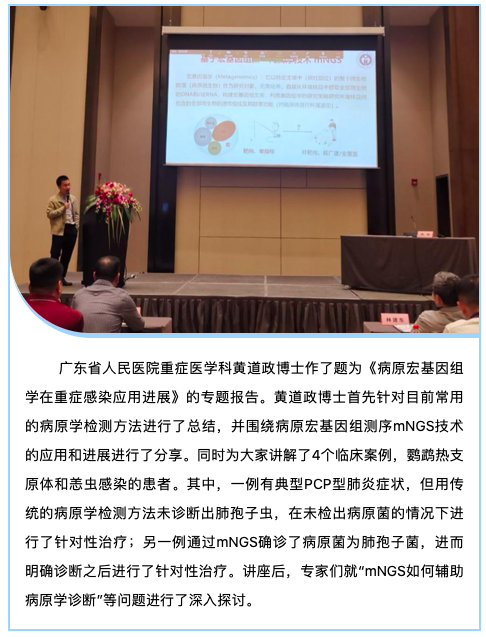 日前,福建省重症医学培训会——中国重症医学多学科精髓(MCCRC)培训班在福州召开。本次培训班邀请了省内外知名专家围绕重症医学领域新技术的开展等内容进行了专题报告,其中,广东省人民医院重症医学科黄道政博士及博奥晶典产品总监刘莹莹博士受邀出席,并作了题为“病原宏基因组学在重症感染应用进展”和“病原宏基因组学报告解读”的专题报告,报告受到福建省医学会重症医学分会主任委员、福建医科大学附属第一医院ICU主任林建东教授的支持与点评。