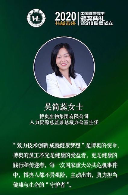 12月18日,由中国人力资源管理研究会携手联合国契约组织国际WELL建筑研究院、太极禅、世界可持续开展领导力组织、上海市著名外企工会联合会及中智上海技术经济技术合作有限公司等组织共同举办的第四届(2020年)中国最佳健康雇主评选在上海揭晓。博奥生物集团凭借抗疫期间的卓越贡献,斩获“抗疫先锋奖”并蝉联“中国十佳健康雇主”。